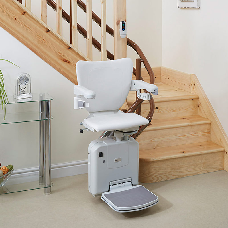 Com o sistema duplo rail esta cadeira adapta-se a qualquer tipo de escada curva e proporciona-lhe uma viagem suave e harmoniosa.