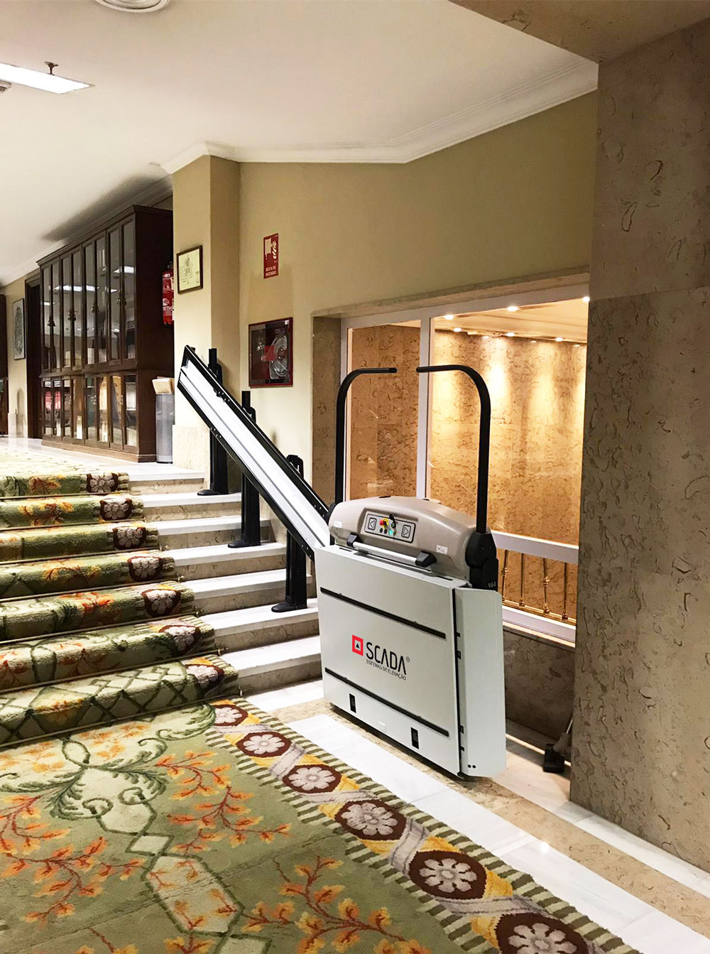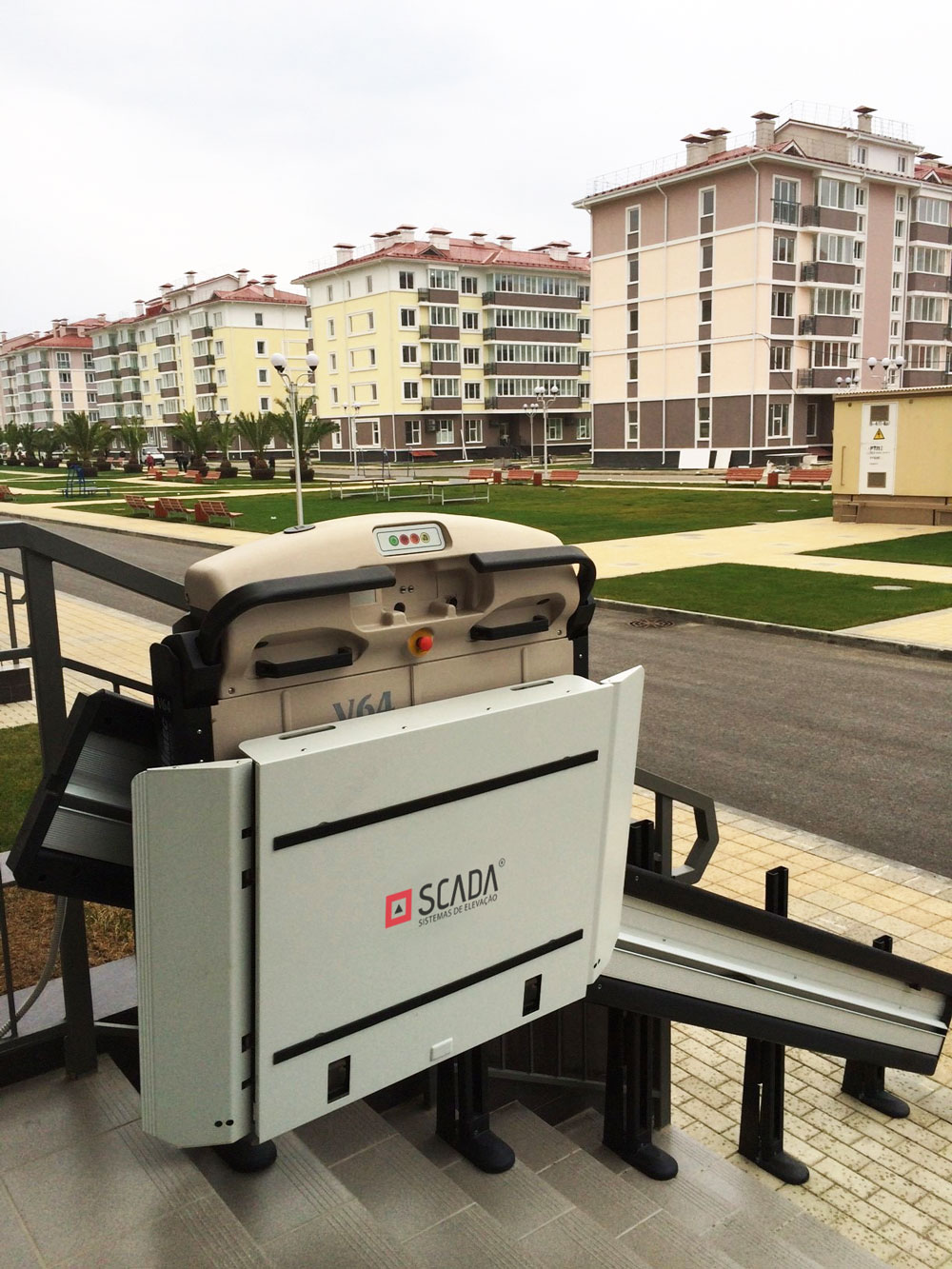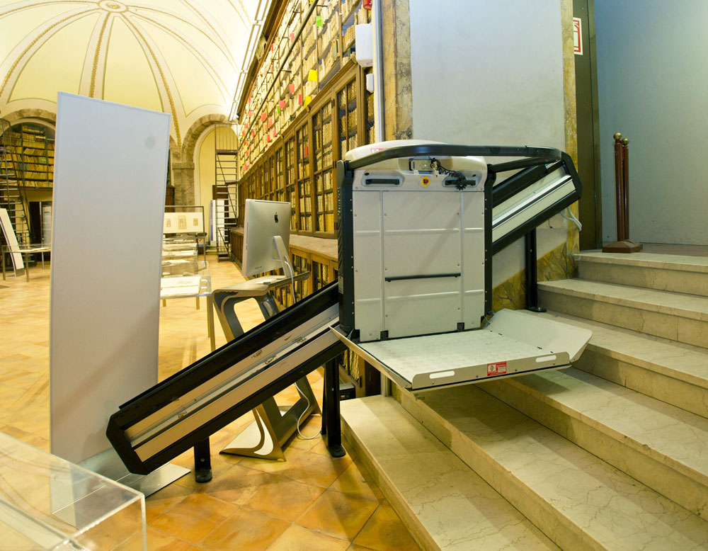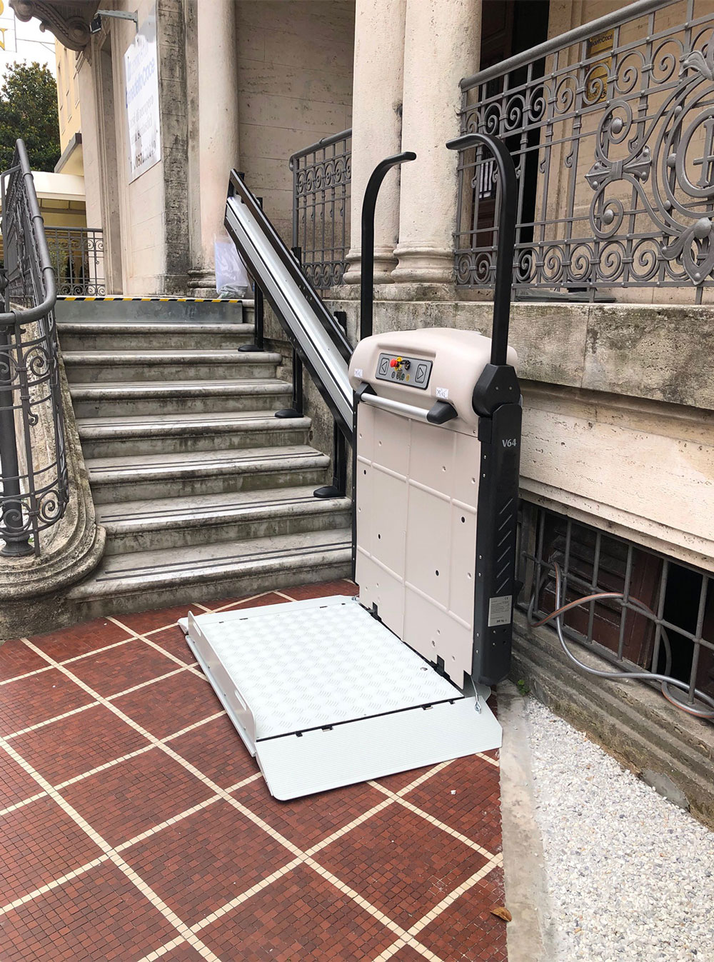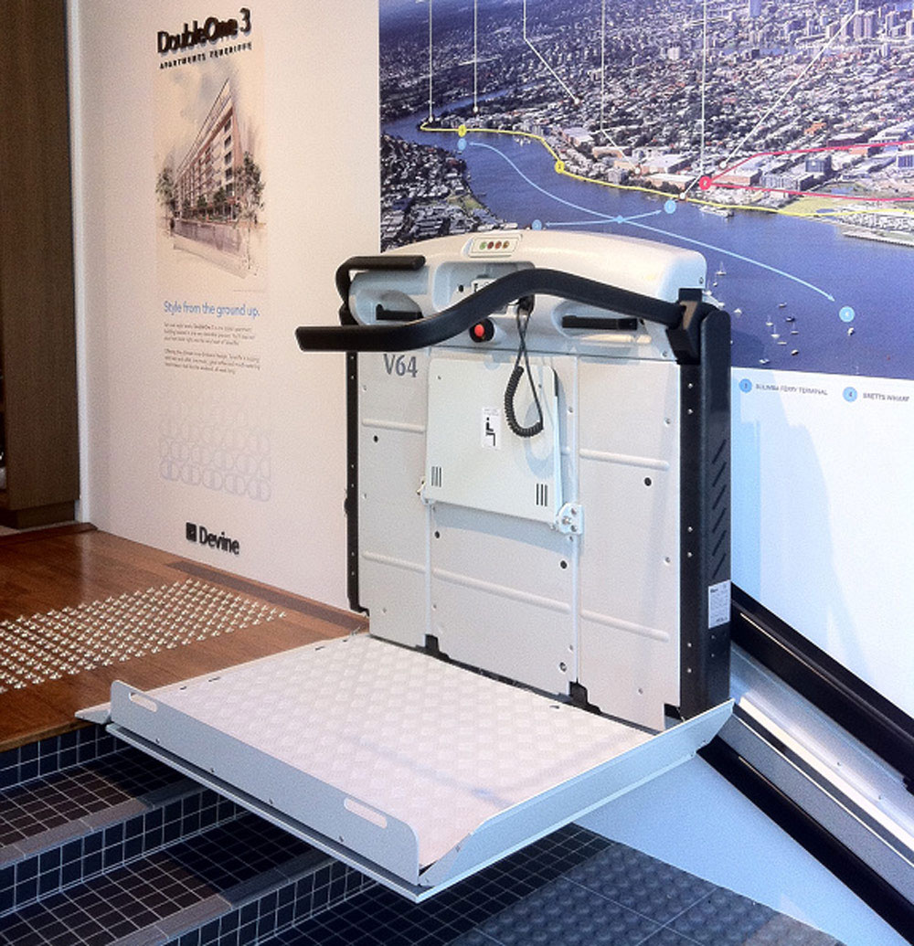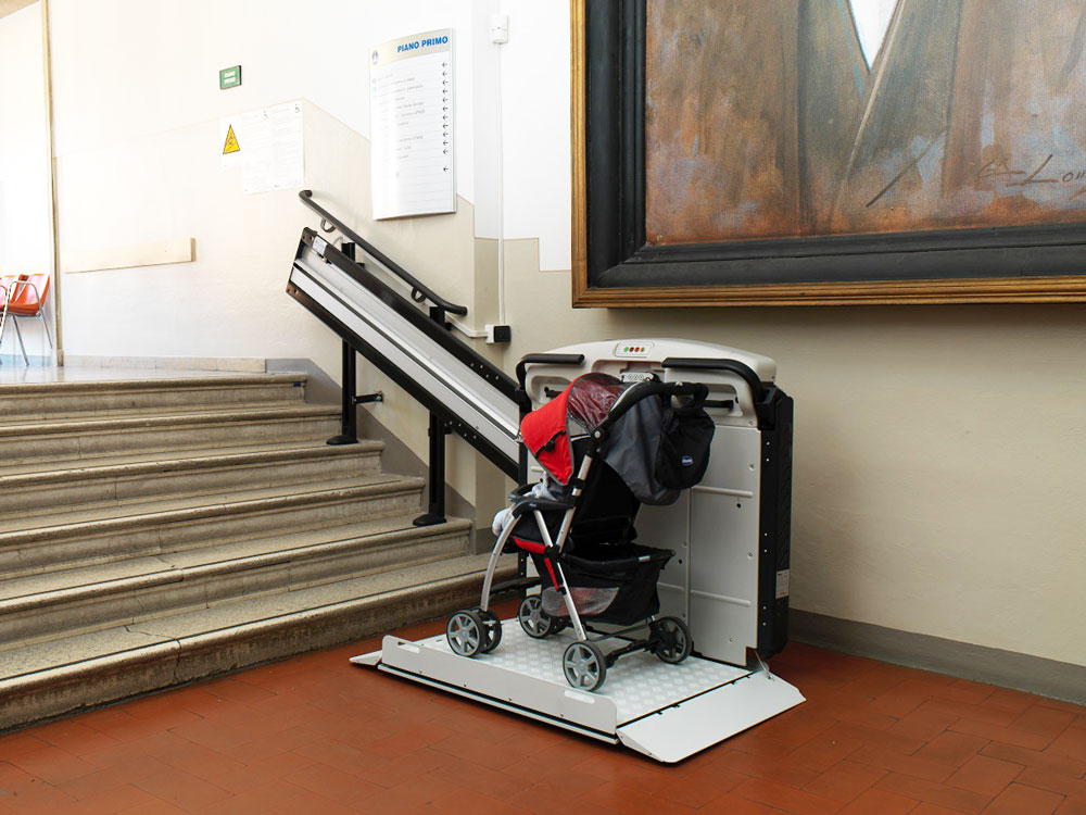 A Plataforma Elevador de Escada “V64” com um estrado para transportar cadeiras de rodas, através de um rail a direito (ideal para percorrer um lance de escadas a direito) é excecionalmente segura e prática.